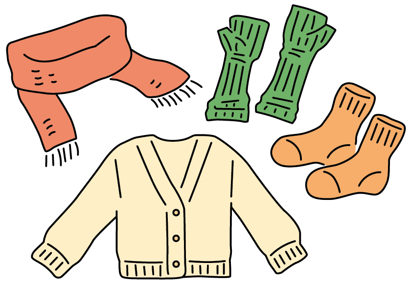 マフラーや靴下、アームウォーマーで冷えに弱い「首・手首・足首」を温めます。重ね着で温度差に対応を。