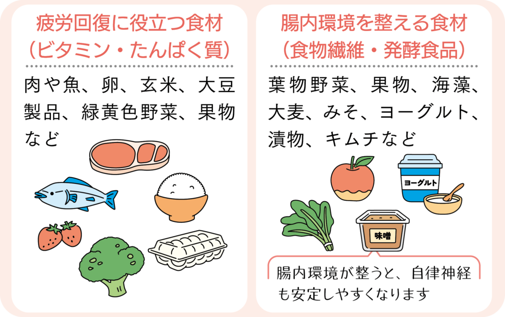 疲労回復に役立つ食材や腸内環境を整える食材を意識して取り入れてみましょう。