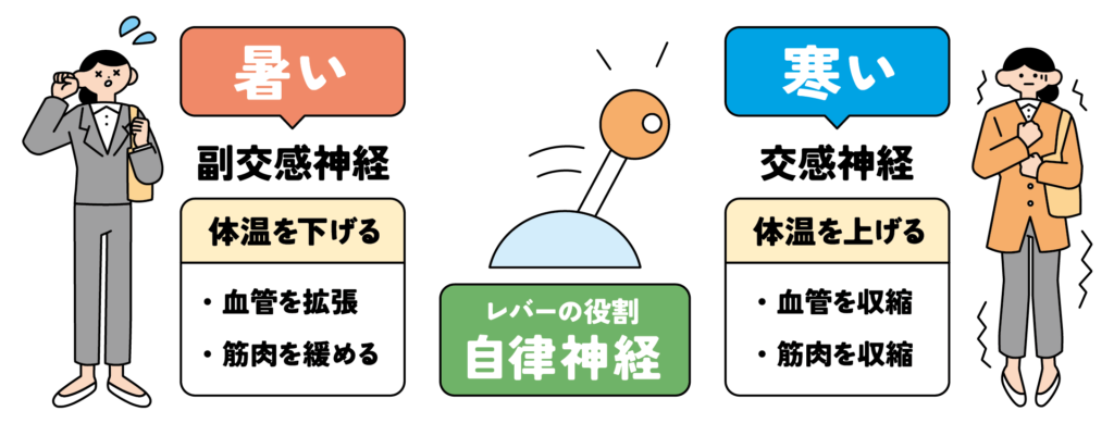 私たちの体は、気温の変化に応じて自律神経(交感神経・副交感神経)が切り替わり、体温や心拍数などを調整しています。