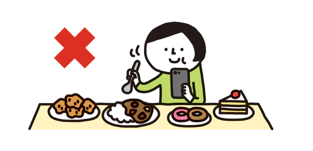 腹八分目を心がけ、スマホやテレビを見ながらの"ながら食い"、ストレス解消のための"やけ食い"、朝食や昼食を抜いての"まとめ食い" など、過食につながりやすい食習慣は改めましょう。